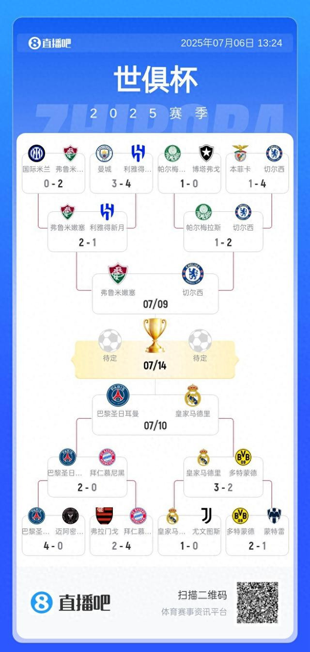 直播吧07月06日讯 世俱杯半决赛对阵出炉,弗鲁米嫩塞vs切尔西,巴黎vs皇马。