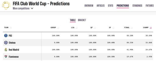 世俱杯概率: 巴黎58.1%进决赛、38.54%夺冠, 皇马24.67%夺冠