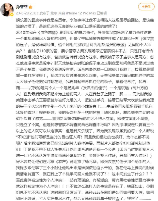 近日,孙菲菲再提被打事件,并公布了当初事发时的一部分细节。