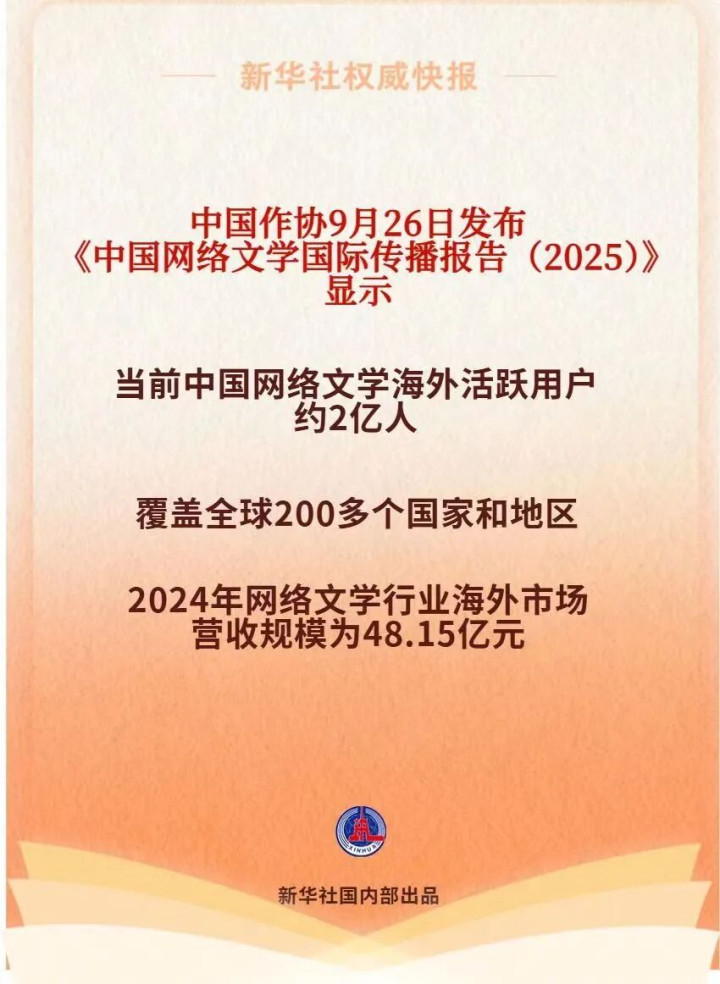 ◆ 26日,中国作协发布《中国网络文学国际传播报告(2025)》显示,中国网络文学海外用户已覆盖全球200多个国家和地区,2024年海外市场营收达48.15亿元。