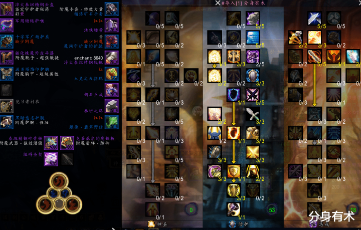 然后我们的一个天赋,就是常规的一个防骑天赋,并不是最优解,像是单刷是没有并要点被治疗回蓝的天赋,可以加到其它地方去,雕文神圣恳求,正义之锤,神圣愤怒雕文,前面2个雕文都属于常规选择,大家应该没有疑虑,很多人可能觉得第三个雕文选择拯救雕文会好点,毕竟20%减伤,但实际上我们神圣愤怒雕文也是有用的,副本里面有不少萨特怪会使用肾击技能,昏迷我们好几秒时间,因此我们用神圣愤怒控制萨特防止我们被秒。