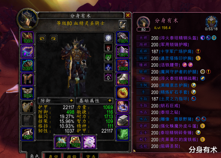 首先我们来看一下这个装备,装备0buff情况下差不多1070的力量,当我们使用庇护祝福,以及极效力量药剂,再加上制皮的狂野战鼓,我们基本上能达到1300左右的力量,整体的一个3维属性也就40%多,然后血量大概26000左右,单刷这里我们泰坦余烬,有两个优先兑换的装备,第一个腰带,可以给我们提升大量的防御属性,再加上我们可以用锻造开一个宝石槽,插上2个34力量宝石,光这1个腰带提升了快100点力量,其次就是饰品,这个饰品不仅给我们提升了大量耐力,而且攻击触发1000点攻强能提升我们单刷速度。