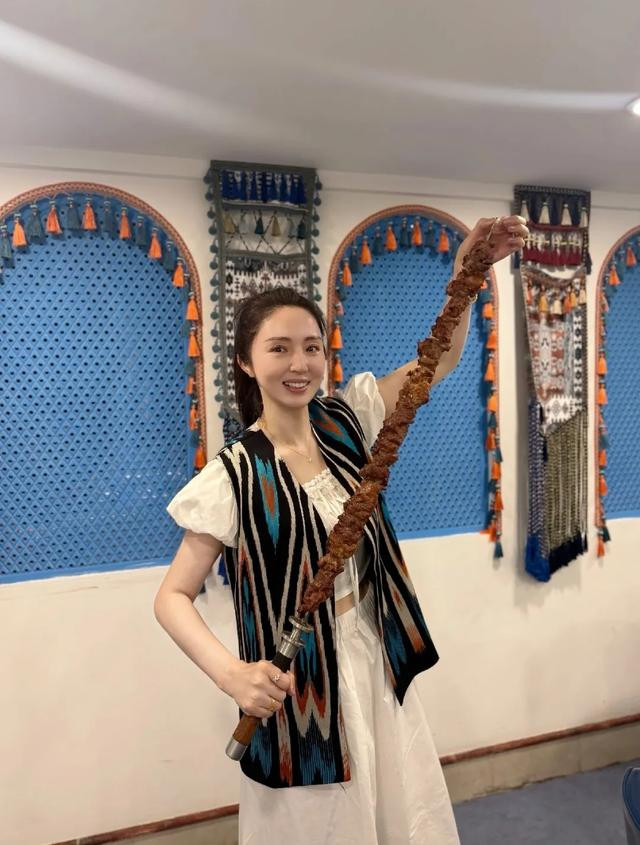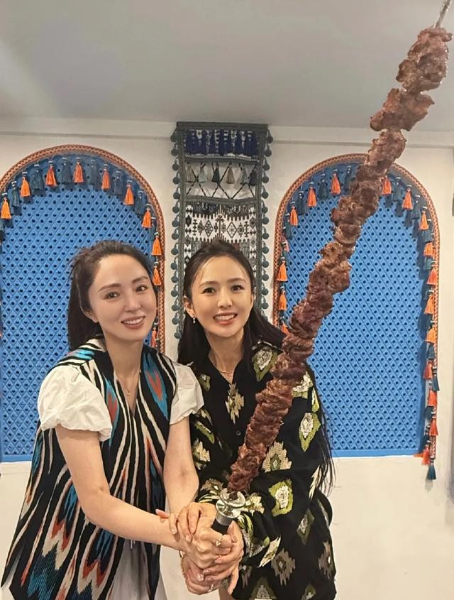 佟丽娅还带着董璇去体验了新疆烤肉,姐妹俩拿着一根一米长的烤肉合影,不得不说,董璇和佟丽娅真的长得好像,跟孪生姐妹花一样。