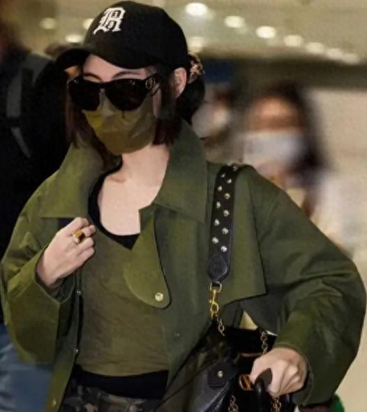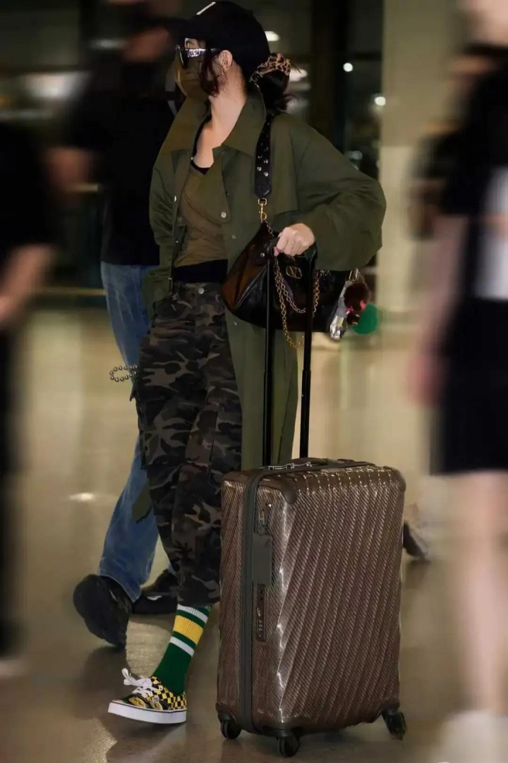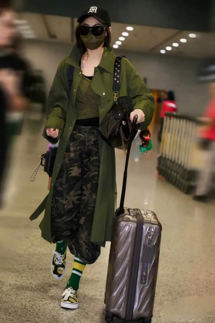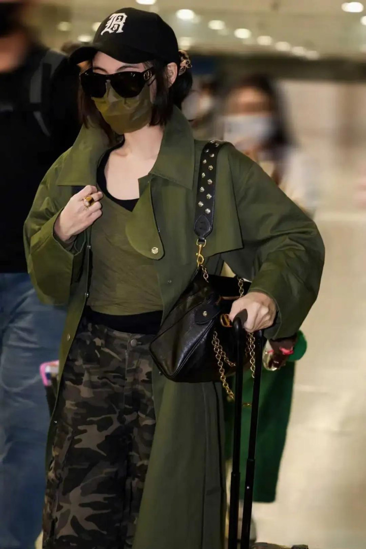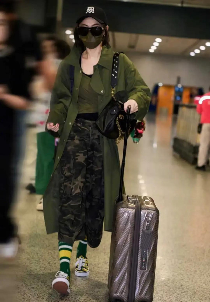 机场偶遇张柏芝, 橄榄绿系搭黑墨镜, 时尚又漂亮