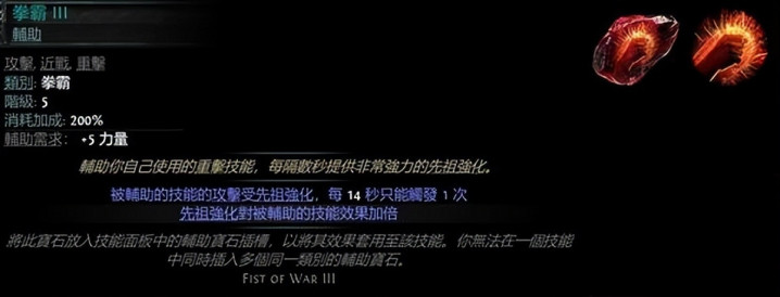 升华搭配拳霸3(国服叫战争铁拳)的辅助宝石,能让我们的输出技能频繁吃到翻倍的先祖强化,从而打出高额的伤害以及提升技能的范围效果