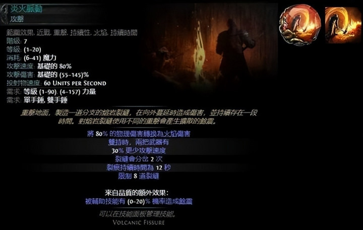 PS:裂缝:触发裂缝的方式有两种,1.当我们人物对着产生的裂缝使用带有重击标签的技能的时,裂缝就会爆发余震产生火海,使用重击技能的频率越高,产生火海的频率也就越高。2.通过堆叠余震概率,当技能自身触发余震而非其他技能触发时,也会激活自身产生的裂缝,从而产生火海。余震:余震是重击技能独有的一个机制,可以通过天赋,升华和宝石品质提高,当概率够高触发余震的时候,相当于重击技能自身会重复释放一次并造成伤害,而余震的伤害是等同于技能首次造成的伤害,打个比方,火山裂隙创造出一条条裂隙,而不论后续你使用别的重击技能去激活多少次裂隙产生火焰打击敌人,裂隙的每次激活伤害都是等同于火山裂隙的第一次伤害。