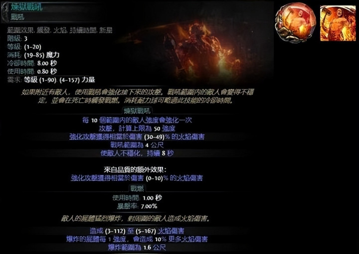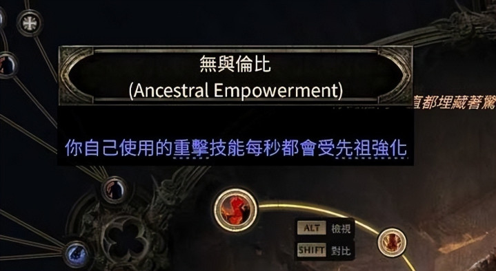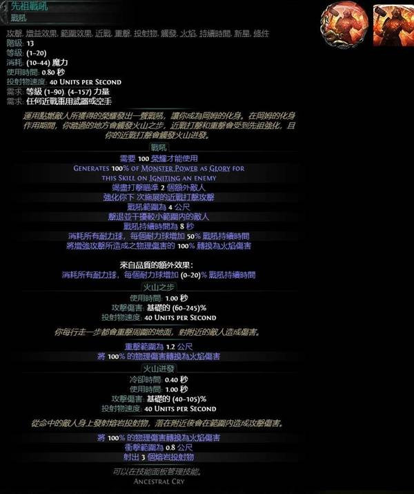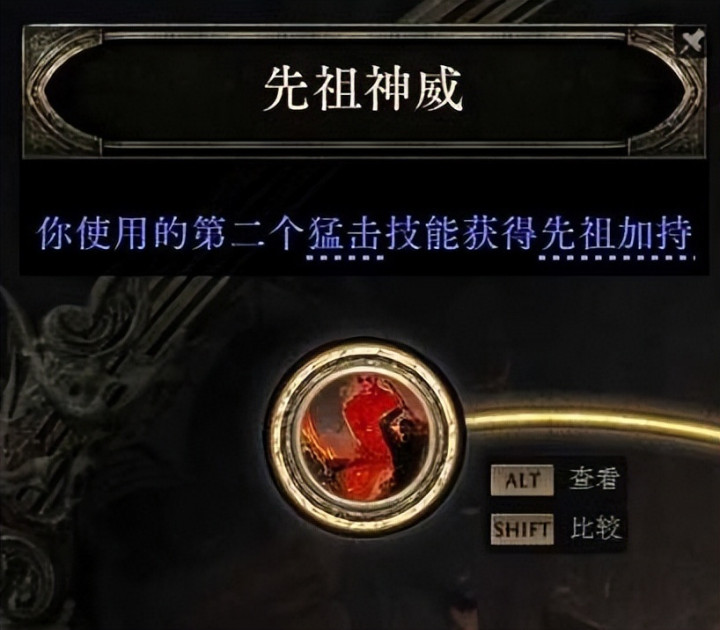 PS:先祖强化(先祖加持):可以使得被强化的重击技能提高30%伤害和25范围效果。升华描述:这里翻译有误,使用一次重击技能后的下次重击技能会收到先祖强化。以上高额的基础伤害再搭配各种增伤辅助宝石以及天赋的大量伤害提升,还有天赋珠宝的大量火焰抗性穿透,从而使得我们的伤害有了保证!