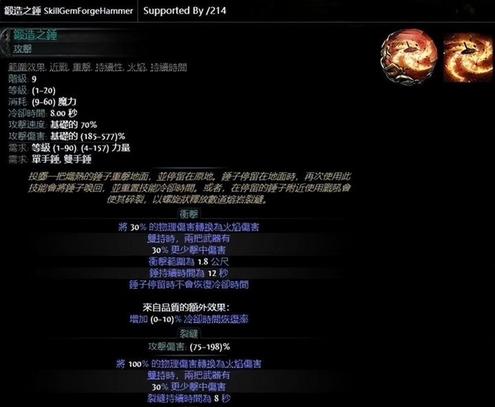 技能说明:1.锻造之锤平时刷图可以带分叉裂缝来提高刷图效率,攻坚换成范围集中就行;2.震波图腾勾选第二栏武器使用,第二栏武器放一把高攻速的单手锤,这样可以进一步提高震波图腾的攻击速度提升激发裂缝的频率;3.天赋和珠宝可以找到大量的火焰抗性穿透,可以把剧情时火焰穿透3的辅助宝石给下下来。
