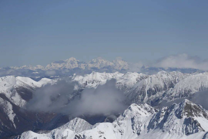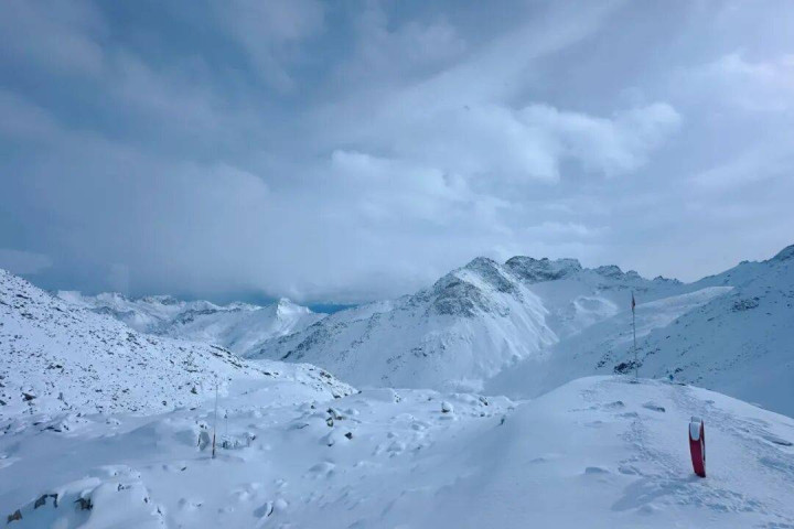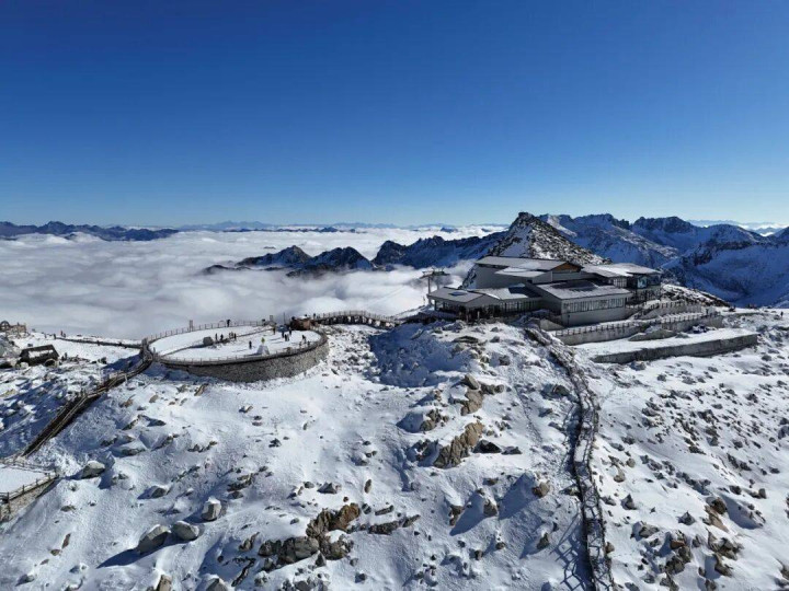 4860冰川之巅观景台:4860米的C位打卡点!脚下是没过脚踝的厚雪,背景是连绵雪山 + 翻涌云海,穿亮色外套(红色、橙色)站在平台,随手拍都是「冬日大片」,定格专属浪漫;