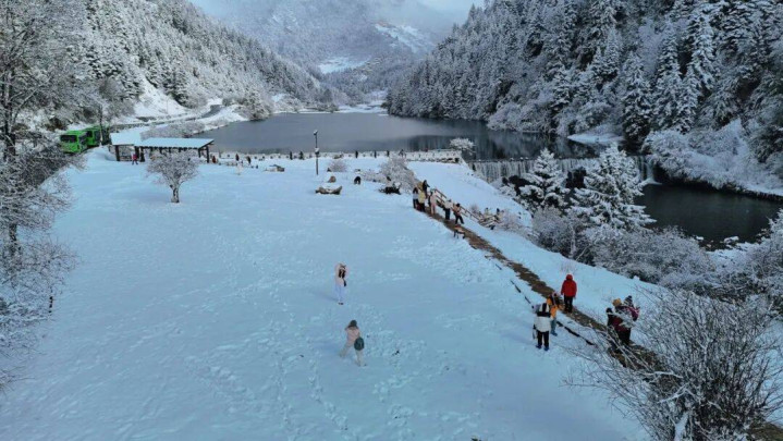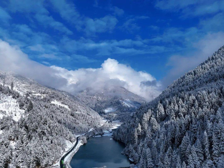 达古湖冰面:湖面开始结冰,雪花覆盖成,踩在铺着雪的栈道上,远处雪山倒映在冰面,仿佛闯进 “双面仙境”,走路时注意放慢脚步~