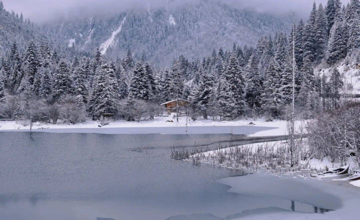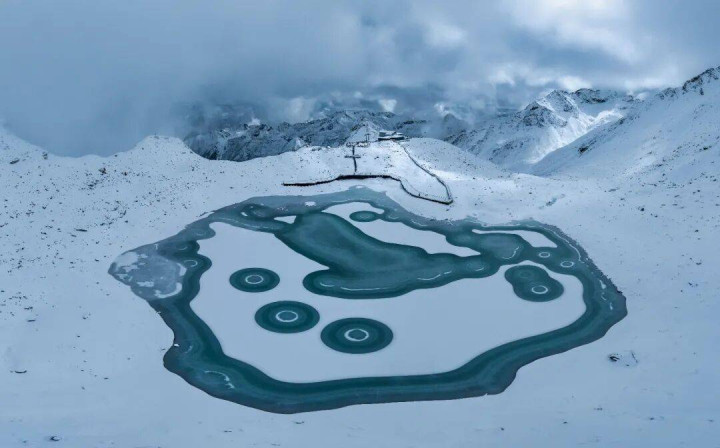 泪湖雪景静赏:4860米冰川之巅上的泪湖,冬季完全被雪覆盖,湖面结着薄冰如 “白玉珊瑚”,站在观景台边,听着风声与雪粒飘落的声音,瞬间治愈所有焦虑。