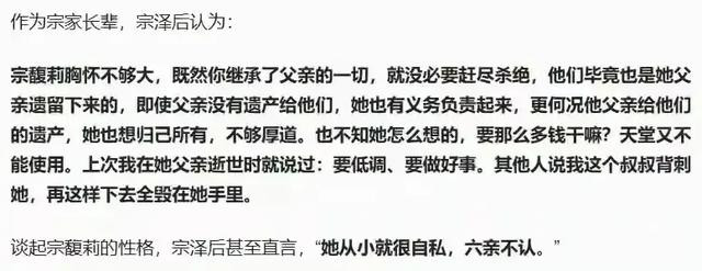 比如当年大家觉得千娇百宠的独生女宗馥莉,在被问到和父亲意见不合的时候,会不会妥协,
