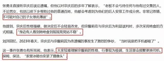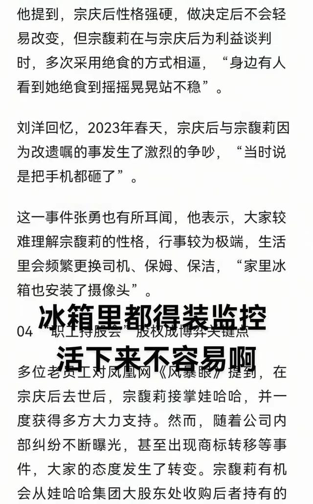 然后就是后续爆出私生子后,宗馥莉被曝性格偏激,会在冰箱都放上摄像头,还会频繁的更换司机,保姆。